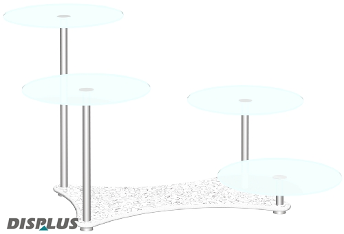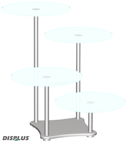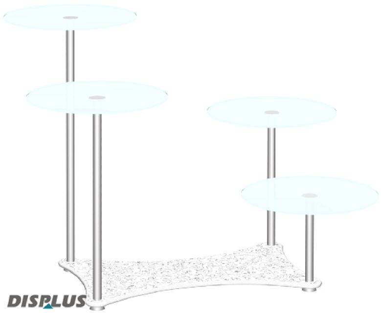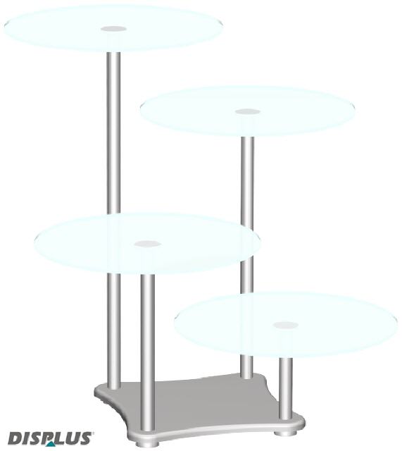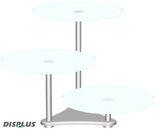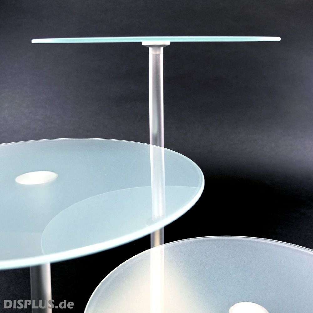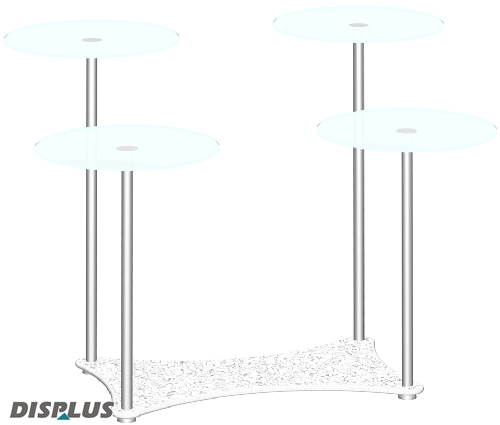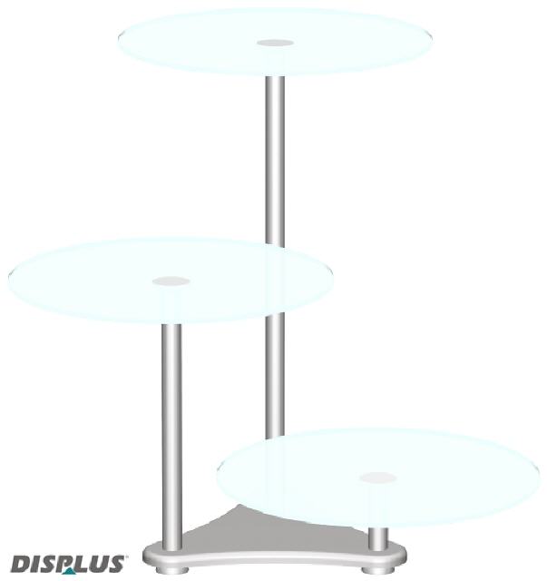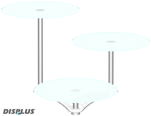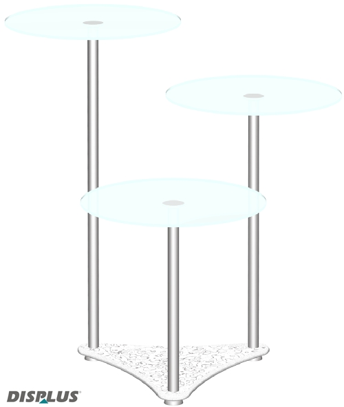 Universelle Drei- bzw. Viersäulen-Präsenter mit Fuß in neutralem MDF oder Polystyrolsplit weiß-silber. Die Stellflächen bestehen aus Mattglas mit einem Durchmesser von 330 mm.